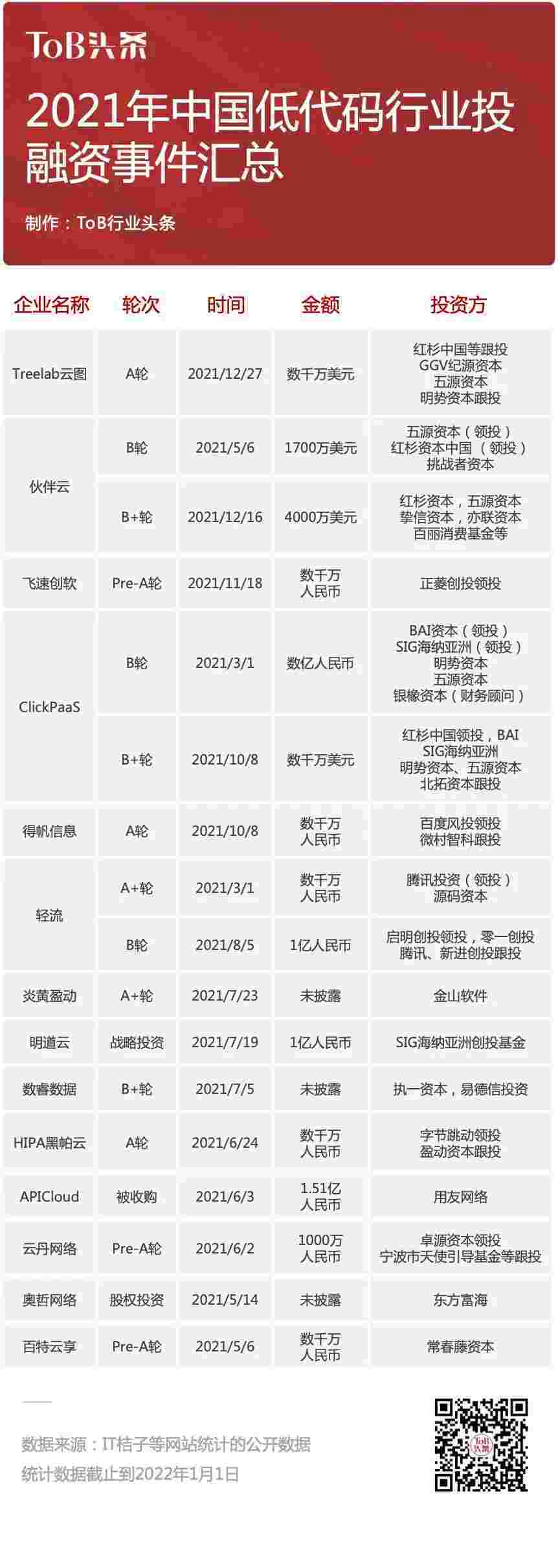到2021年,,,,,,,,无/低代码投融资规模势头更甚,,,,,,其中包括轻流两轮融资(A+轮数千万人民币,,,,,,,,,,,,,,B轮近亿人民币)、、、、、、、、、、小米钱包 两轮融资(B轮数亿人民币,,,,,,,B+轮数千万美元)、、、、、、、、、、百特云享数千万元Pre-A轮融资......