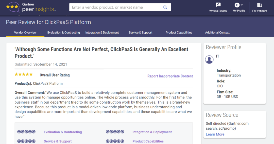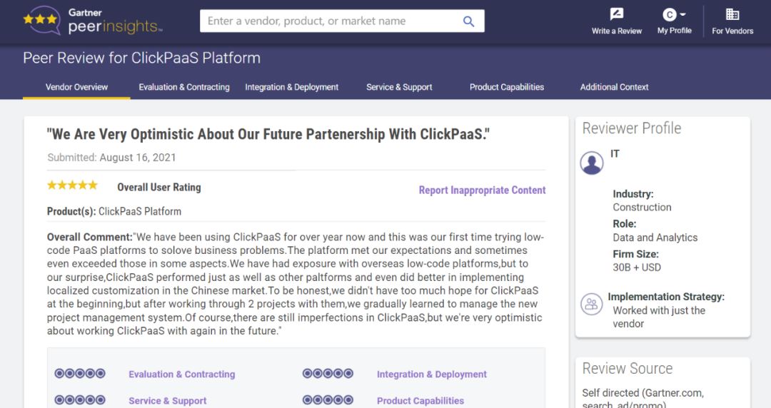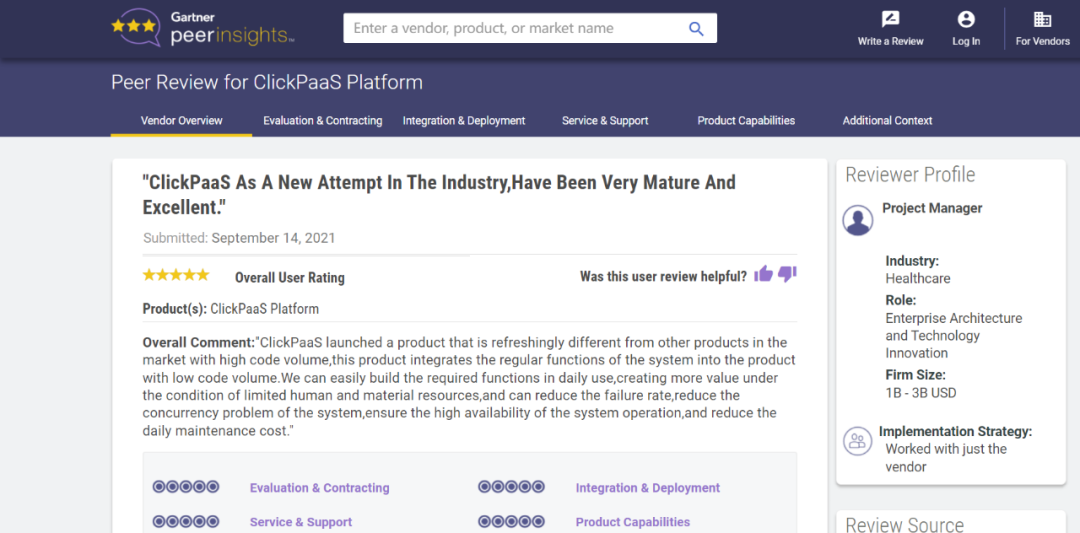 Tips::::::::::::【Peer Insights】——用户对企业IT产品和服务发布真实评价的平台。。。。。。。。目前已有355个市场,,,,,,,255,000条经过验证的评价。。。。。。。。每一条评价Gartner会针对参评企业营收规模及参评人员信息做验证、、、、、、、评价内容做多维核实。。。。。。。。。。。